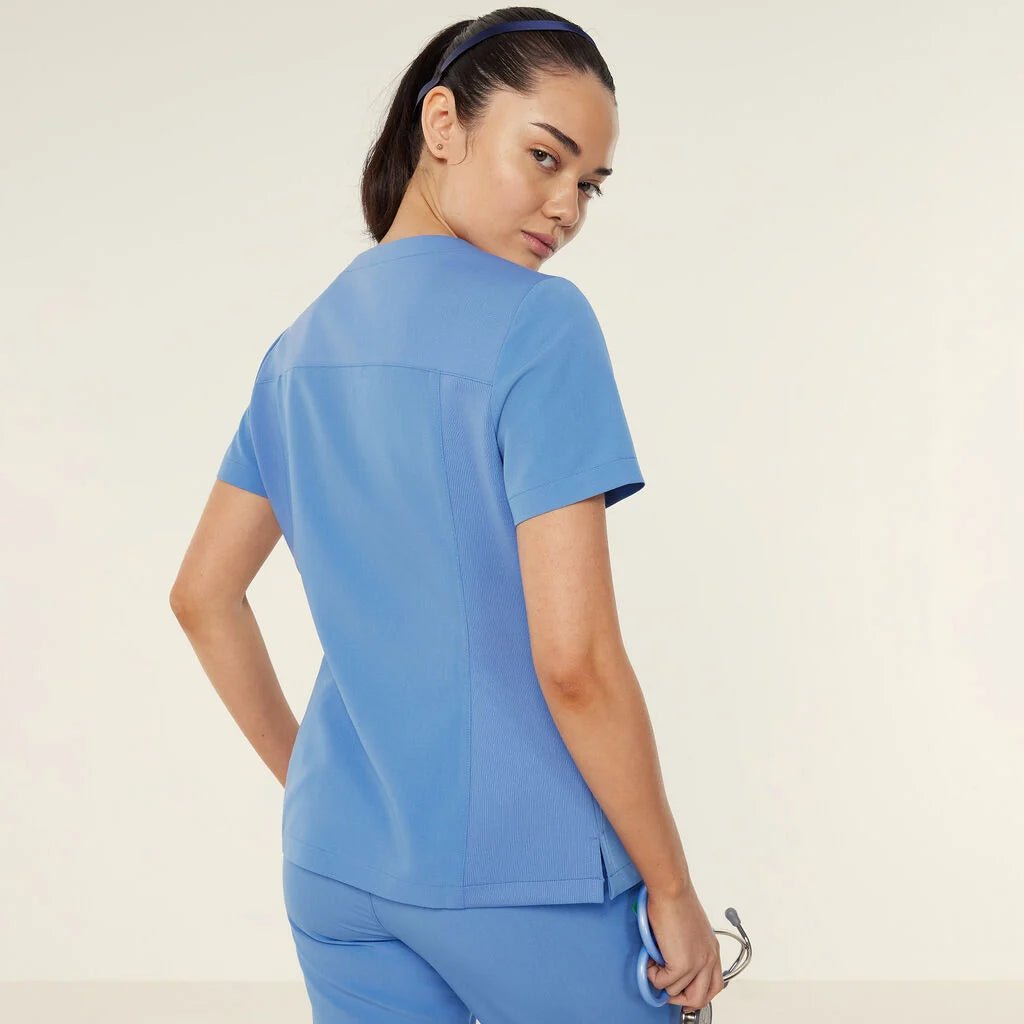 The Helen Scrub Top combines a sleek slim fit with all-day comfort. Designed with a flattering V-neck, easy pull-on styling, and a mid-length cut, it’s made to move with you. Short sleeves and high-stretch rib side panels offer flexibility on the go, while side hem splits enhance mobility even further.